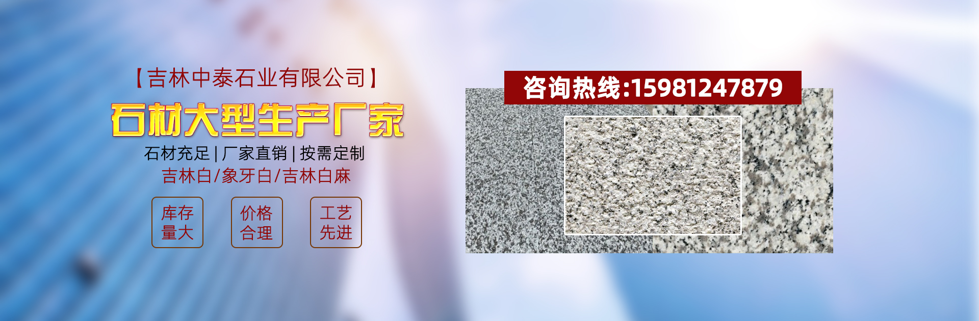 廠區(qū)占地12萬平方,配備有高標(biāo)準(zhǔn)的大切20臺,紅外線15臺,石材生產(chǎn)線配套齊全。具備大規(guī)格、大規(guī)模精加工石材的能力,日產(chǎn)量5000平方。本公司主營吉林白(象牙白),可生產(chǎn)加工光面、荔枝面、火燒面等各類石材加工需求,承接出口、內(nèi)銷,專業(yè)地鐵、高鐵、機場等其他大型公共商業(yè)中心項目。